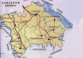 The rivers Padma, Kumar, Modhumoti, Aarial Kha, and Chandana have made the land of Faridpur fertile. The fertile land not only produces good crops, but also great personalities. When Bangladesh, in 1971, was going to be independent, it was internationally renowned as the country of Sheikh Mujibur Rahman. He was born in Tungipara in the then Faridpur district (now Faridpur has divided into five districts, i.e. Faridpur, Madaripur, Gopalgong, Shariatpur, and Rajbari ). Tungipara is now in the Gopalgong district. Mujib's graveyard is also in Tungipara.