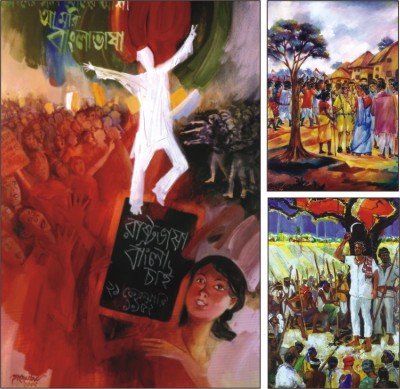 (Left) “Language Movement” by Hashem Khan, (top right)“Tebhaga Movement” by Samarjit Roy Chowdhury and (bottom right)“Nuraldin’s Rebellion” by Iftikhar Uddin Ahmed.