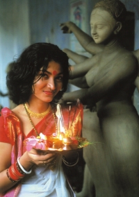 * The word 'Lakshmi' is derived from the Sanskrit word Laksya, meaning 'aim' or 'goal', and she is the goddess of wealth and prosperity, both material and spiritual. Lakshmi is the household goddess of most Hindu families, and a favorite of women. Although she is worshipped daily, the festive month of October is Lakshmi's special month. Lakshmi Puja is celebrated on the full moon night of Kojagari Purnima.