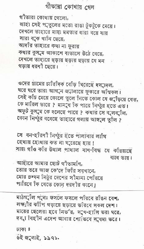 on the day of Independence 1971, at Kamlapur , DhakaWhen Dhaka was liberated in 1971, I followed the Indian Army to report the event for The New York Times. The first thing I did was to ask my escort to put me in touch with Jasimuddin. He was a celebrity known to every Bangladeshi as Kobi Jasimuddin and his house, Palash Bari. I was invited for dinner and introduced to the rest of the family (Khushwant Singh,Daily Telegraph,Calcutta, India, May 30, 2009).