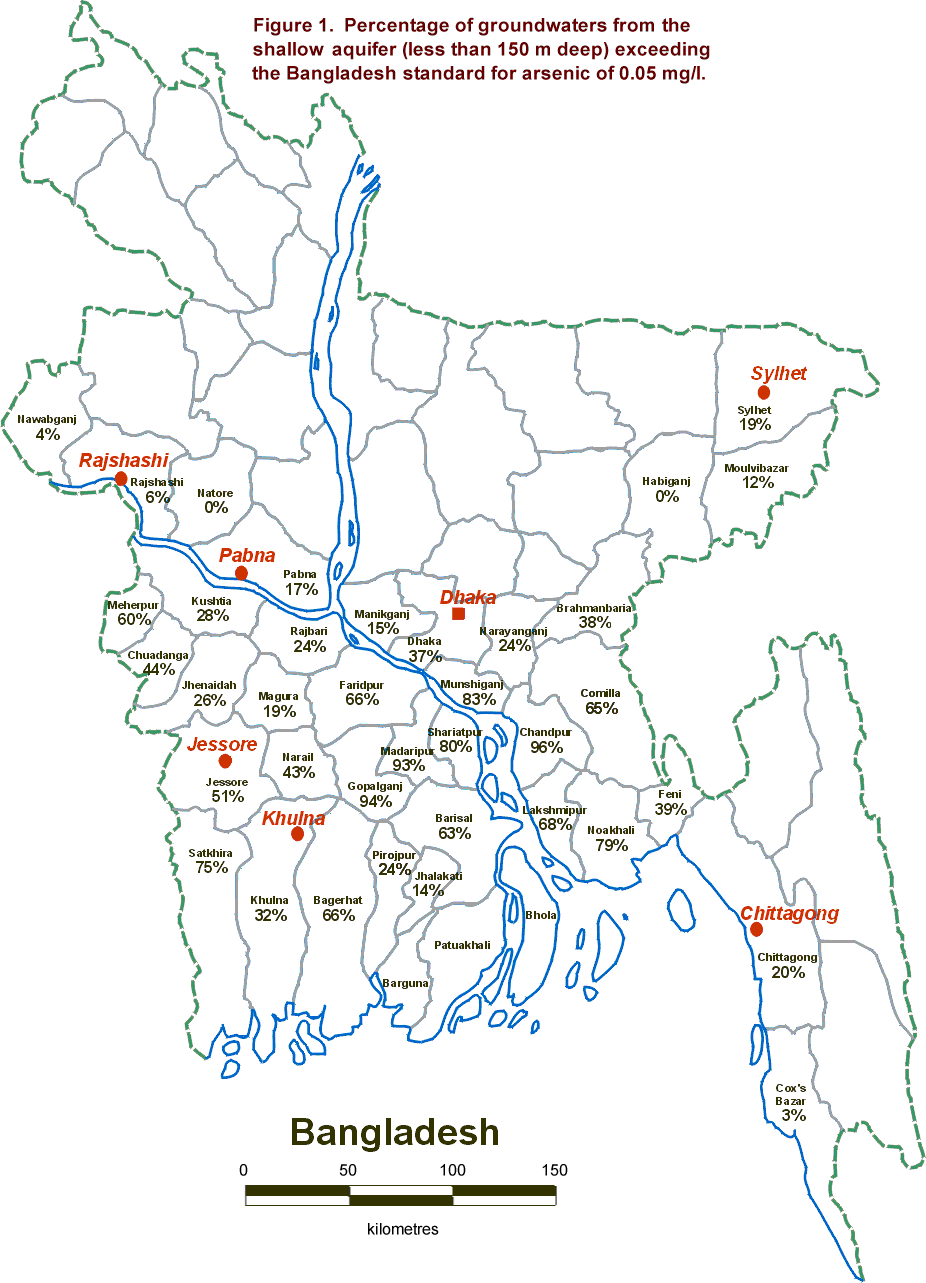 No uniform standard methods for collecting samples and analysis were applied for the determination of arsenic content. Recent verification in several rural areas of Bangladesh shows that areas shown to be arsenic free (less than 50µg/l) in the above map, in fact, contain dangerous level of arsenic in water