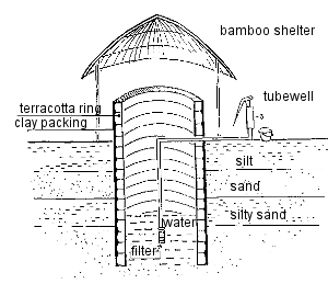- A thick layer of clay mixed with jute will be placed around the wall of the well to prevent contamination from the shallow ground or from the surface and collapsing of the wall. This will be further protected through lining of terra cotta rounded clay rings. Converted hand pumps and roof with bamboo material or tin are constructed after the completion of dug wells. The wells are covered and water is drawn from the well using hand pump (tube well).