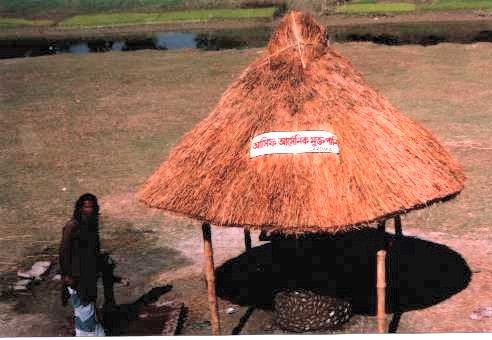 Constructor Bayati (Village Concert Musician) Mannan is proud of Arsenic free Disease free Dug Well with hand pump and filter (January 2002). This is the first Dug Well after 30 years at Village Ambikapur, District Faridpur. Hundreds of people drinking water from here. Local tea shops made advertisement - "Arsenic Free Tea Available Here". People is getting inceptive to make their own well. Most people does not know that dug wells are arsenic free. Thirty years ago each house had a dug hole for drinking water.I was astonished to hear about his knowledge on ground water, capillary pressure, casing mechanism, oxygen content in hole and water and disinfections of water by traditional wisdom. His long haired son Mannan, an well known Bayati (Folk Concert Singer), cannot only make dug hole can also play excellent flute and violin.