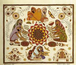 Three great religions of Bangladesh, i. e., Hinduism (Modern hinduism is the result of a blending orthodox Brahmanism with non-Aryan materialistic superstitions) which came earliest, Buddhism second and Islam. There is no denying the fact, the oldest inhabitants of Bangladesh known as Australoid, then the Dravidians, Aryans and the Muslims made a chequered history of this region and the Nakshi Kantha (An embellished quilt embroidered in traditional motifs and innovative style by rural women of Bangladesh) found a unique character as a multi religious product and also a multiracial expression.